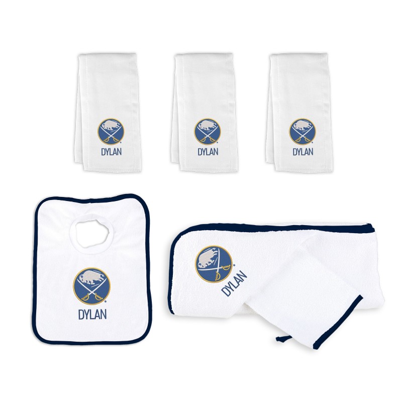 - Includes 3 personalized burp cloths, a personalized pullover bib, and a personalized hooded towel and wash mitt