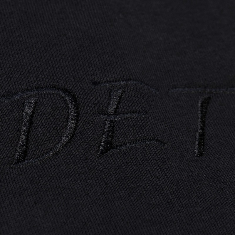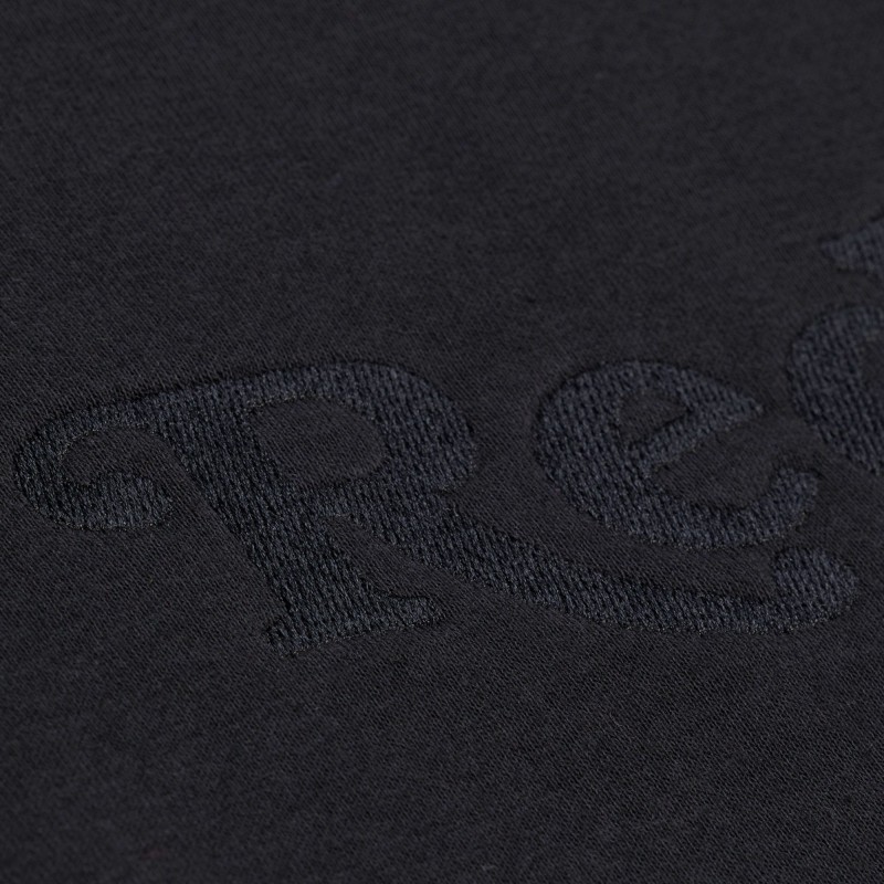 - Embroidered wordmark and fabric appliques across the chest, on both sleeves and across the back