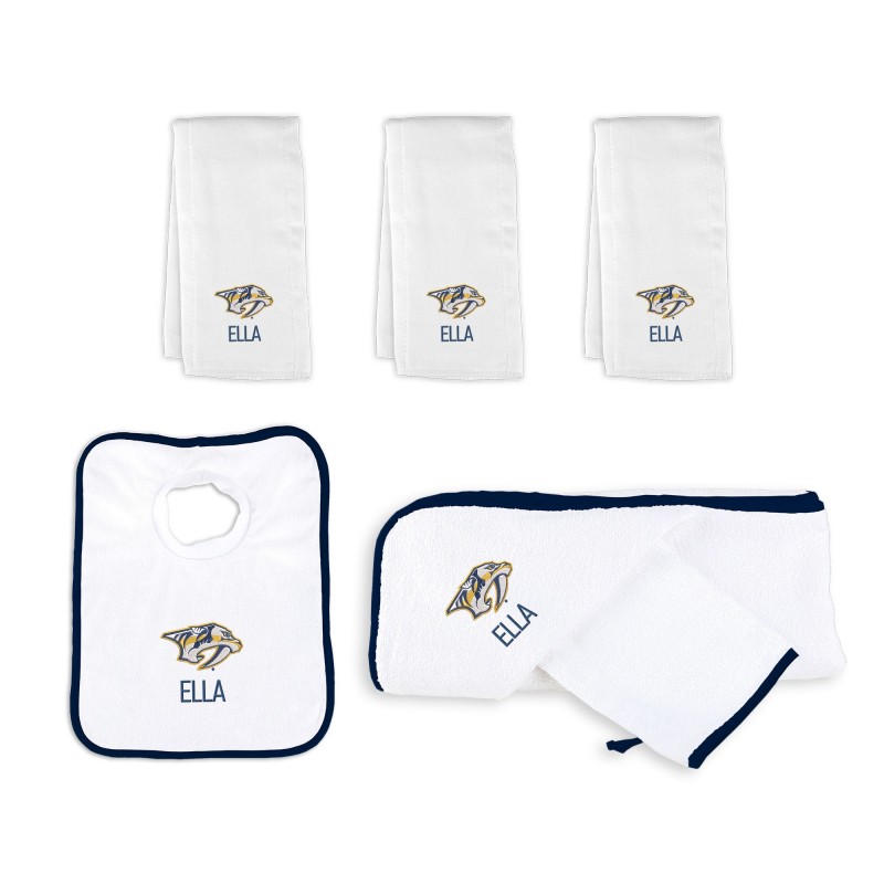 - Includes 3 personalized burp cloths, a personalized pullover bib, and a personalized hooded towel and wash mitt