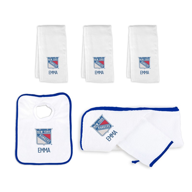 - Includes 3 personalized burp cloths, a personalized pullover bib, and a personalized hooded towel and wash mitt