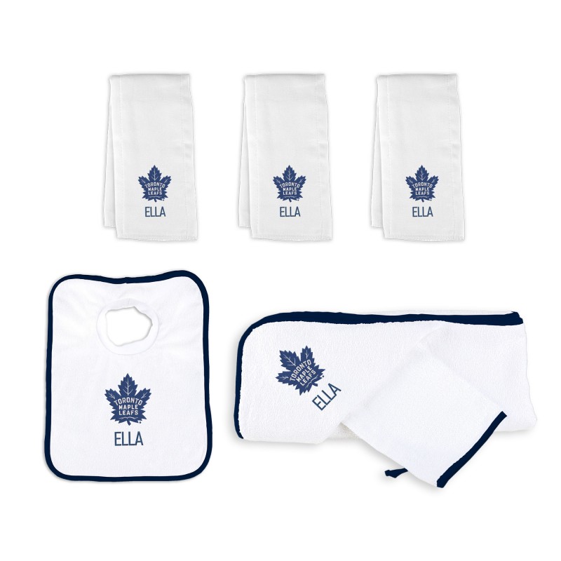 - Includes 3 personalized burp cloths, a personalized pullover bib, and a personalized hooded towel and wash mitt