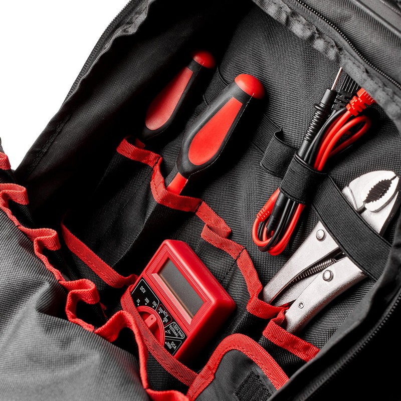 - 14 inside pockets and 3 outside pockets as well as a molded bottom that provides a flat surface to stand the tool backpack upright in any environment and elevates your tools so they do not become damaged. ,